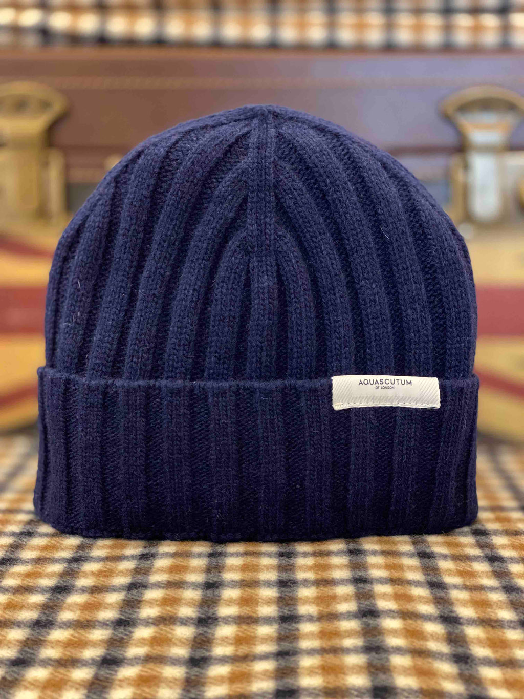 Cappello modello cuffia di Aquascutum of London, in lana a coste larghe, vestibilità aderente alla testa.